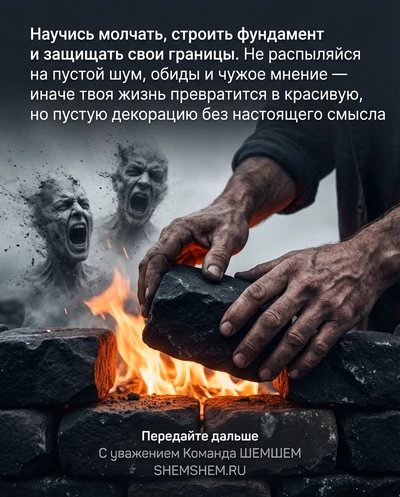 | Восьмая Заповедь ШЕМШЕМ Научись молчать, строить фундамент и защищать свои границы. Не распыляйся на пустой шум, обиды и чужое мнение — иначе твоя жизнь превратится в красивую, но пустую декорацию без настоящего смысла. Болтливость — это утечка силы. Когда ты рассказываешь о своих планах или оправдываешься перед критиками, ты расходуешь ту самую энергию, которая должна была пойти на кладку фундамента. Твои границы — это не способ отгородиться от мира, это способ сохранить себя для дела. Если в твоем доме нет стен, в него может зайти любой бродяга и натоптать в твоей душе своими обидами и мнениями. Защищать границы — значит понимать, что твое внимание — это самый дорогой ресурс, и ты не имеешь права раздавать его бесплатно тем, кто создает лишь шум. Пустая декорация выглядит эффектно, но она рухнет при первом же серьезном сквозняке. Настоящий смысл живет в тишине закрытой стройплощадки, где ты медленно и верно создаешь то, что простоит века. ШЕМШЕМ-комментарий: Твое «да» ничего не стоит, если ты не умеешь говорить «нет». Тишина — это твоя броня. Пока ты споришь с тенями в чужих головах, твоя собственная стройка стоит. Перестань быть доступным для каждого прохожего. Закрой периметр, выключи звук и клади кирпич. Твой фундамент — это единственное, что спасет тебя, когда декорации сгорят. Вам будет интересно: Наше Десятисловие: 10 правил осознанной жизни Не выбирайте глазами, выбирайте сердцем.Откройте свою следующую мудрость...