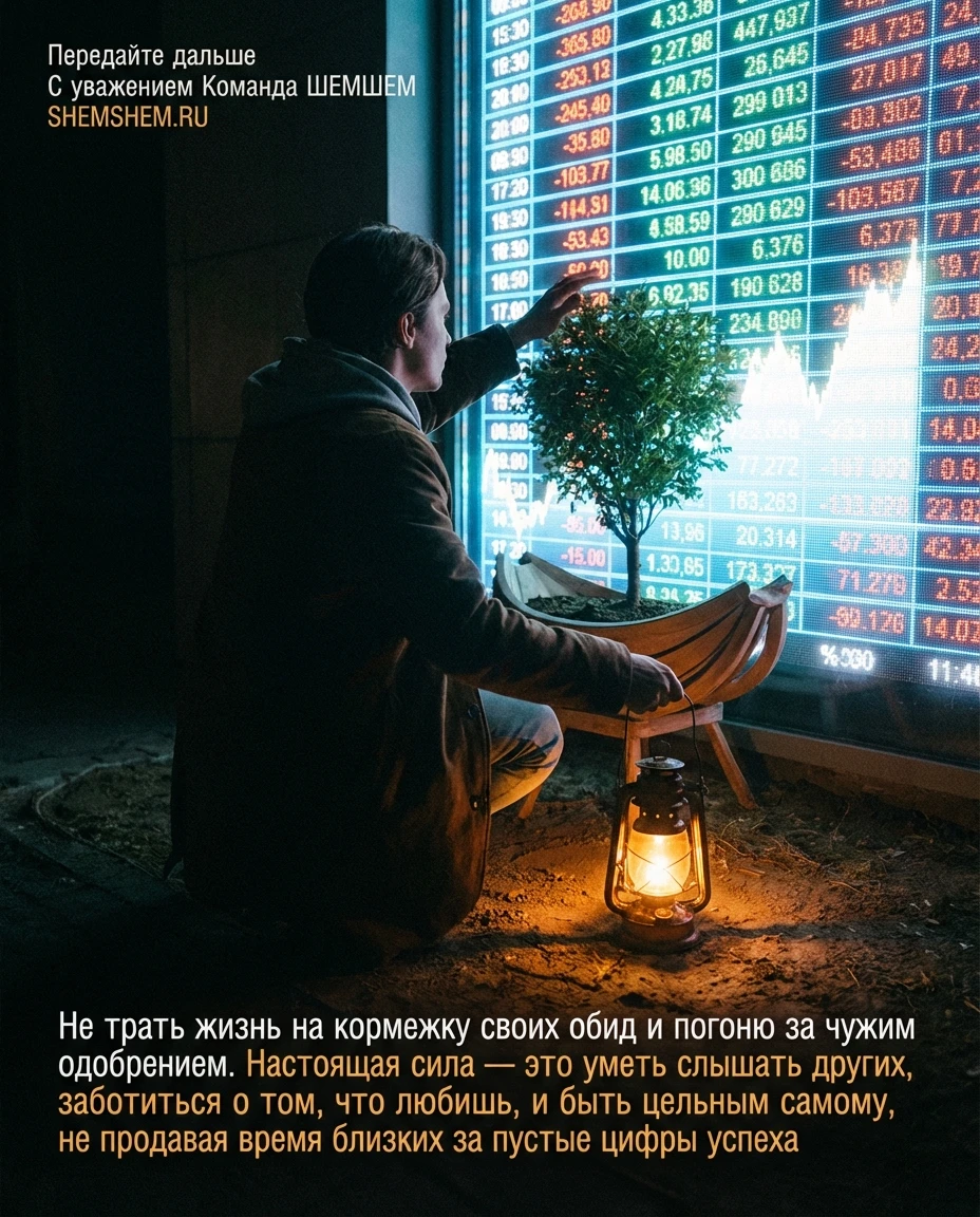 | Седьмая Заповедь ШЕМШЕМ Не трать жизнь на кормежку своих обид и погоню за чужим одобрением. Настоящая сила — это уметь слышать других, заботиться о том, что любишь, и быть цельным самому, не продавая время близких за пустые цифры успеха. Обида — это яд, который ты пьешь сам в надежде, что умрет кто-то другой. Это черная дыра, пожирающая твое время и внимание. Погоня за одобрением — такая же ловушка: ты пытаешься купить любовь за валюту успеха, которая обесценивается быстрее, чем ты успеваешь её заработать. Настоящая цельность проявляется в тихой способности выбирать живое вместо механического. Услышать другого — значит выйти за пределы своего эго. Заботиться о том, что любишь — значит инвестировать в вечность, а не в статистику. Когда ты продаешь время, проведенное с близкими, за «пустые цифры», ты совершаешь самую невыгодную сделку в истории: меняешь единственное невосполнимое сокровище на пыль, которая разлетится при первом же ветре. ШЕМШЕМ-комментарий: Твои обиды — это гири, которые ты кормишь своим мясом. Брось их. Чужое одобрение не согреет тебя ночью, когда будет по-настоящему холодно. Сила — это не количество людей, знающих твое имя, а качество твоего присутствия рядом с теми, кто тебе дорог. Не будь богатым нищим, у которого есть всё, кроме времени на любовь. Вам будет интересно: Наше Десятисловие: 10 правил осознанной жизни Не выбирайте глазами, выбирайте сердцем.Откройте свою следующую мудрость...