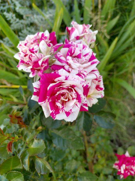 На краю сада, словно яркое пятно на фоне зелёной листвы, расцвела миниатюрная роза «Старс энд Страйпс». Её лепестки, белоснежные с малиновыми полосками, напоминают праздничный фейерверк. Каждый цветок — это маленькое произведение искусства, где природа проявила свою фантазию.