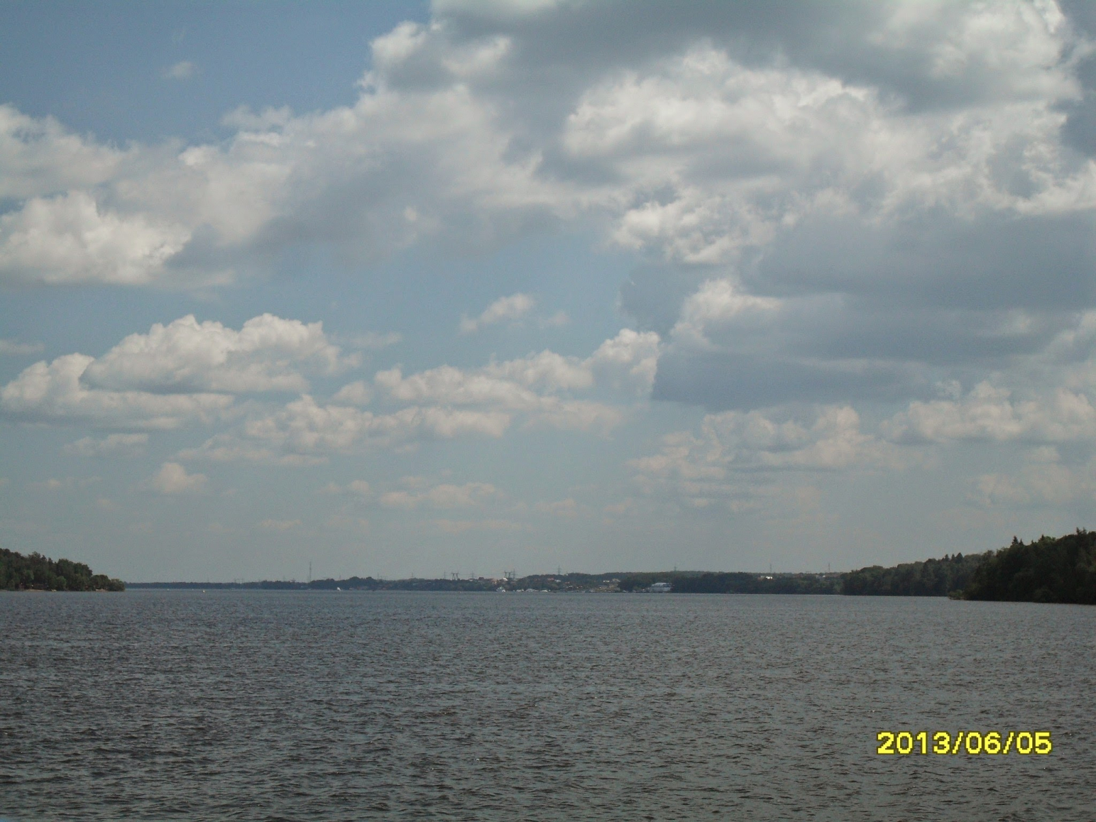 На этом снимке, сделанном 5 июня 2013 года, запечатлён спокойный участок реки Москвы. Широкая водная гладь занимает передний план, отражая мягкий свет летнего дня. Поверхность реки слегка рябит от лёгкого ветерка, создавая ощущение умиротворения и покоя.