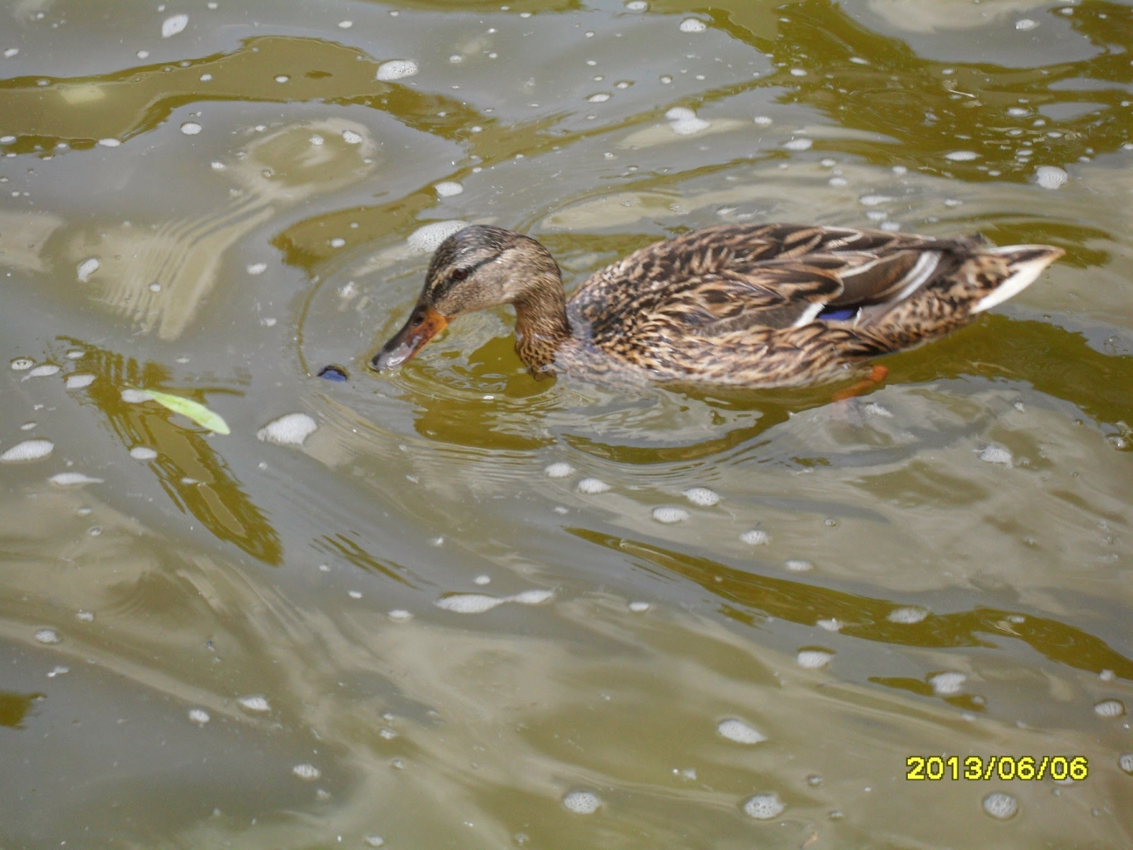 Вода вокруг утки мутноватая, с характерным зеленоватым оттенком, что может указывать на наличие водорослей или тины — типичная картина для городских водоёмов в летний период. На поверхности воды заметны пузырьки и лёгкая рябь, созданная движениями утки. Отражения и блики на воде добавляют динамики и глубины снимку.