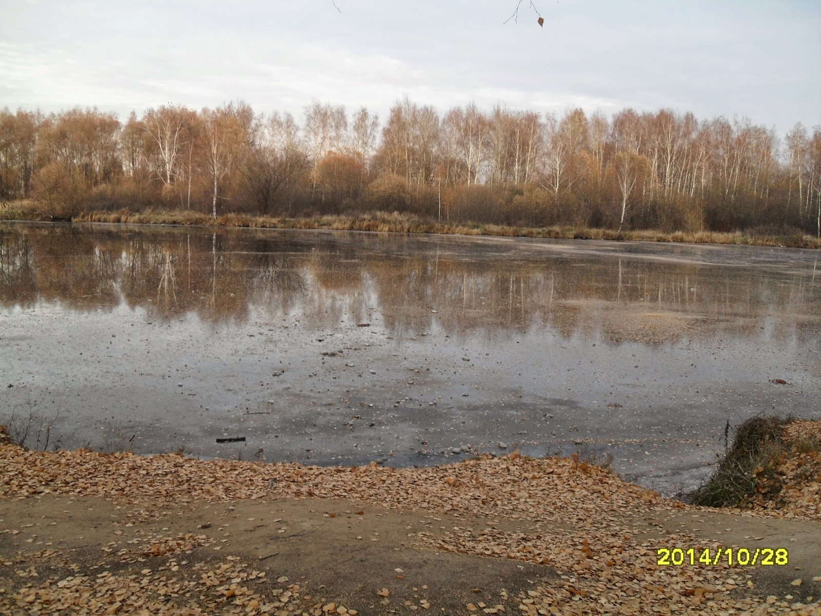 На этом фото запечатлён один из тех редких, умиротворяющих моментов октябрьской Москвы, когда природа замирает в спокойствии перед наступлением зимы. Перед нами — тихая гладь озера, словно зеркало, отражающее стройный ряд берёз, стоящих на противоположном берегу. Их ветви, уже почти лишённые листвы, рисуют на фоне пасмурного неба изящные узоры, напоминающие тонкую вышивку.