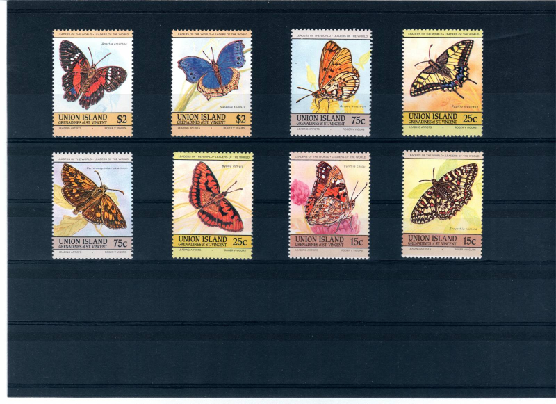 На изображении представлен малый лист из восьми почтовых марок, выпущенных островом Юнион (Union Island), входящим в состав Гренадин Сент-Винсента. Каждая марка посвящена разным видам бабочек и оформлена в ярком, детализированном стиле с акцентом на природную красоту насекомых. (марки из моей коллекции)