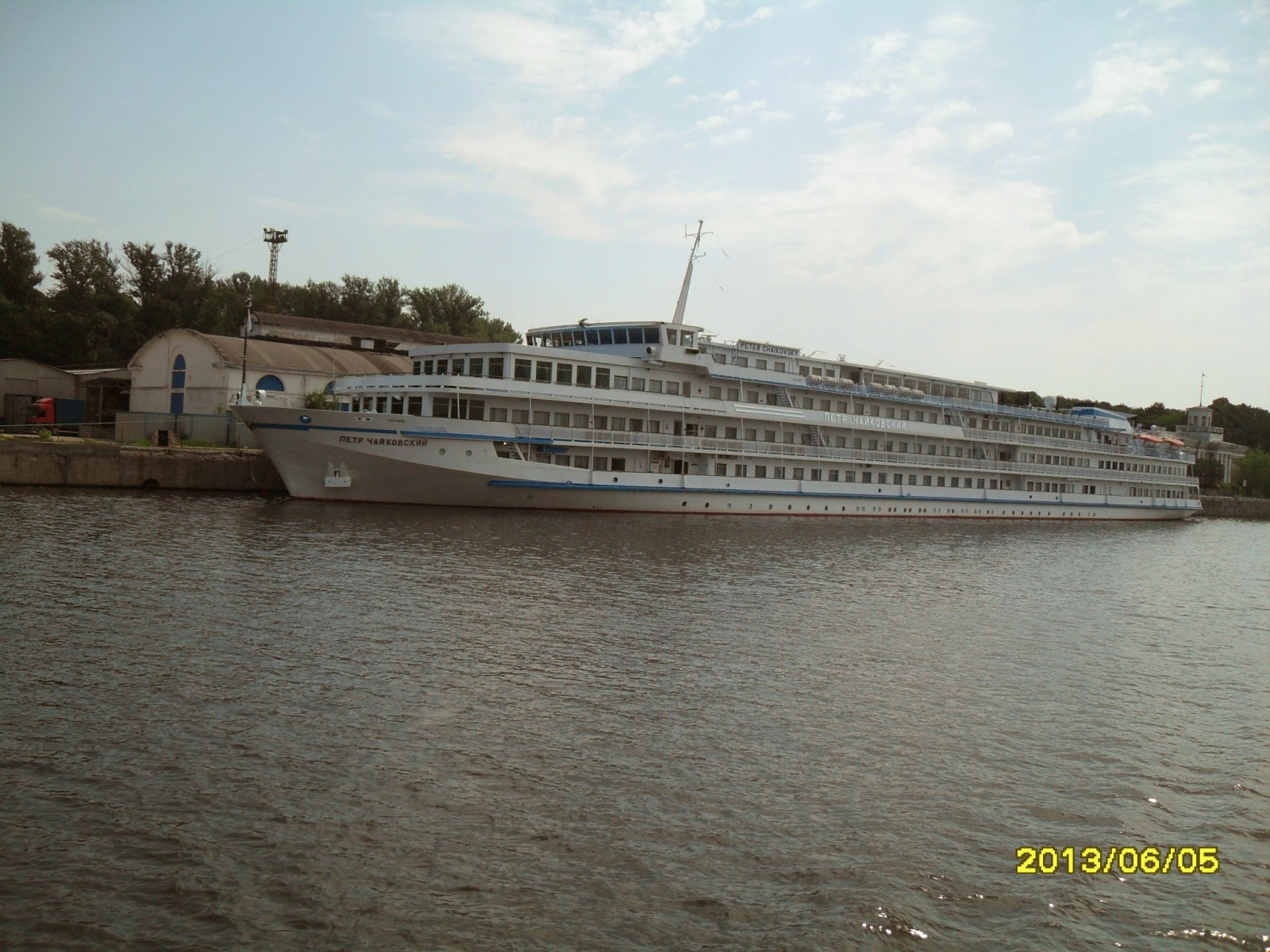 На фотографии изображён теплоход «Пётр Чайковский», пришвартованный у берега в Москве. Снимок сделан 5 июня 2013 года.