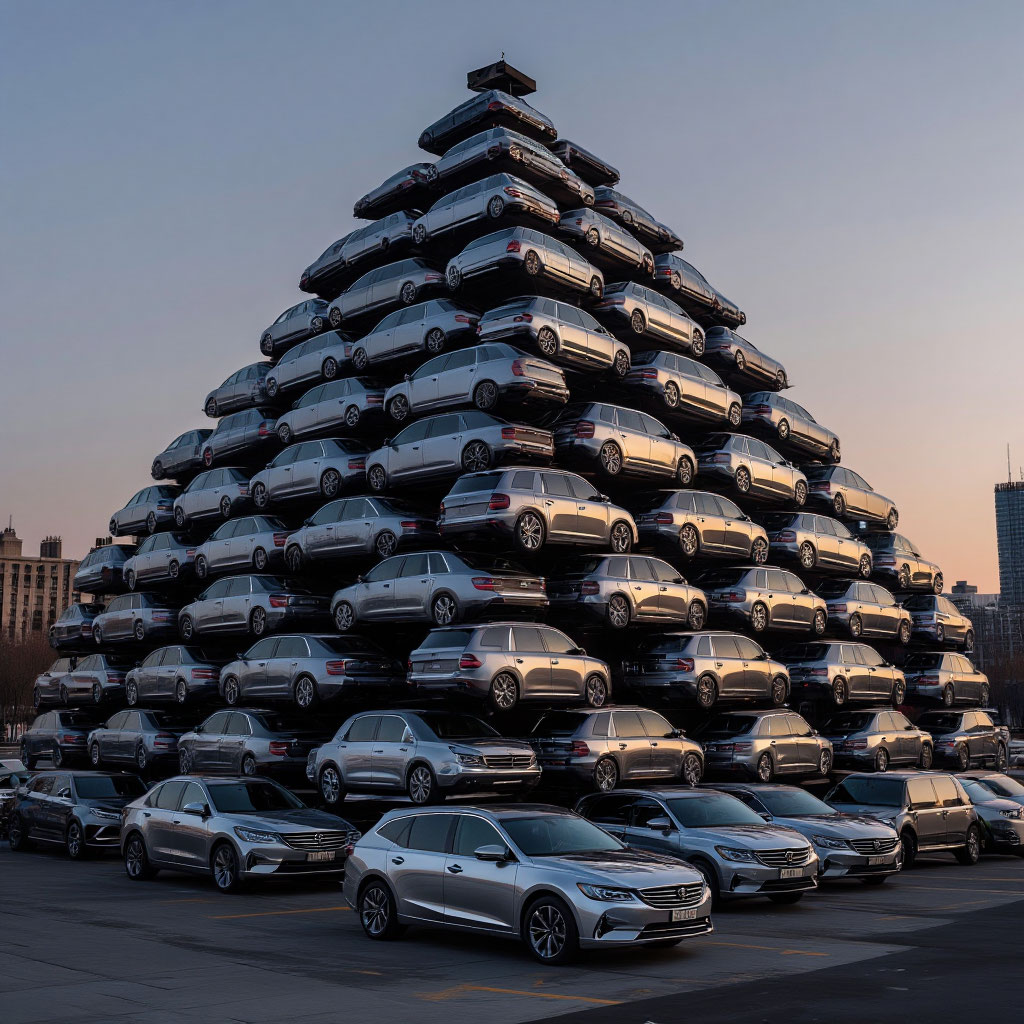 На пустынной парковке, под закатным небом, возвышается невероятная конструкция — пирамида из автомобилей. Серебристые и черные машины, словно застывшие в танце, образуют идеальную геометрическую фигуру. Их отражения играют на солнце, создавая иллюзию бесконечного блеска.
