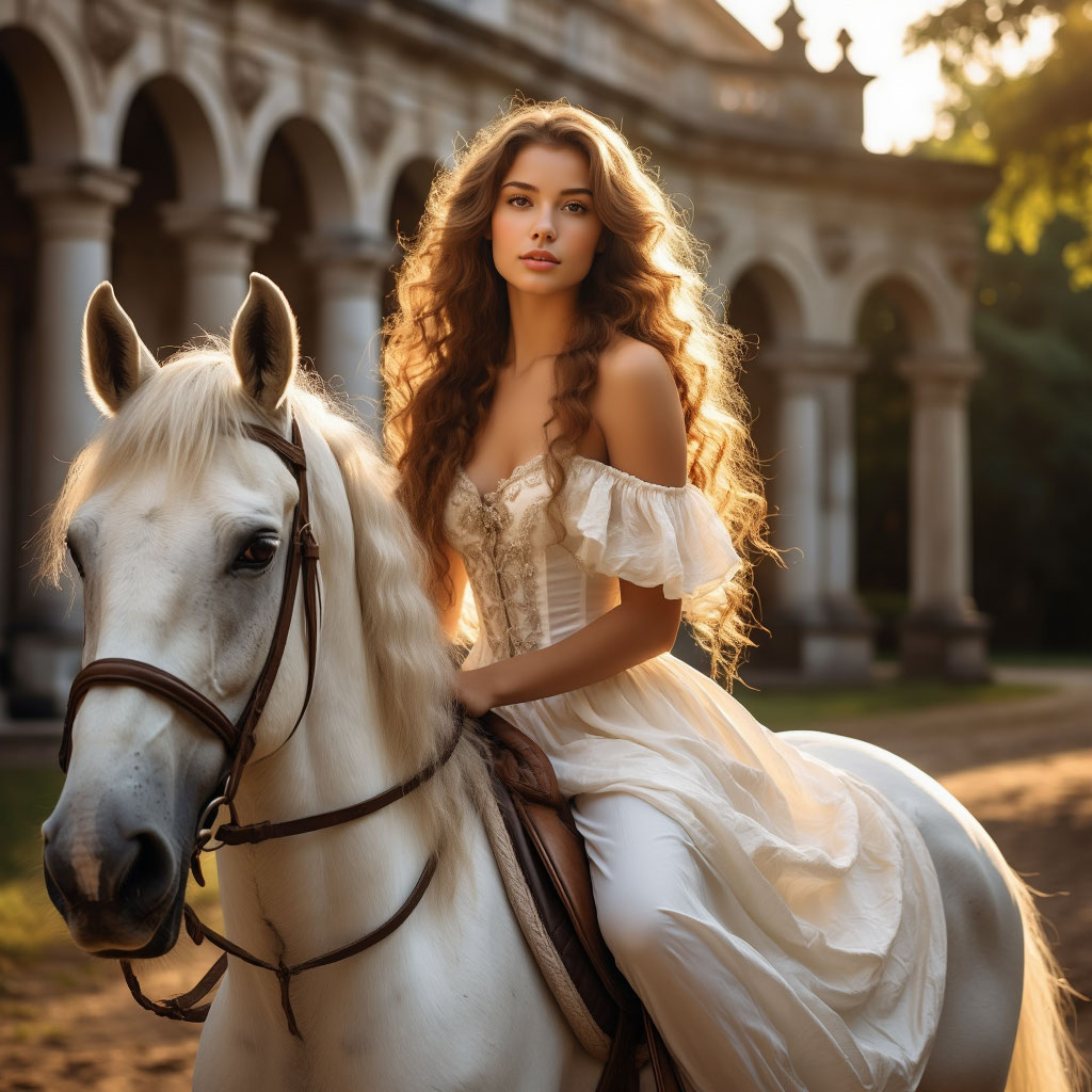 В одном из старинных парков, где время словно остановилось, молодая девушка в белом платье с открытыми плечами сидела верхом на белоснежной лошади. Её длинные волнистые волосы развевались на ветру, словно крылья ангела, а солнечные лучи, пробиваясь сквозь листву, создавали вокруг неё ореол света.