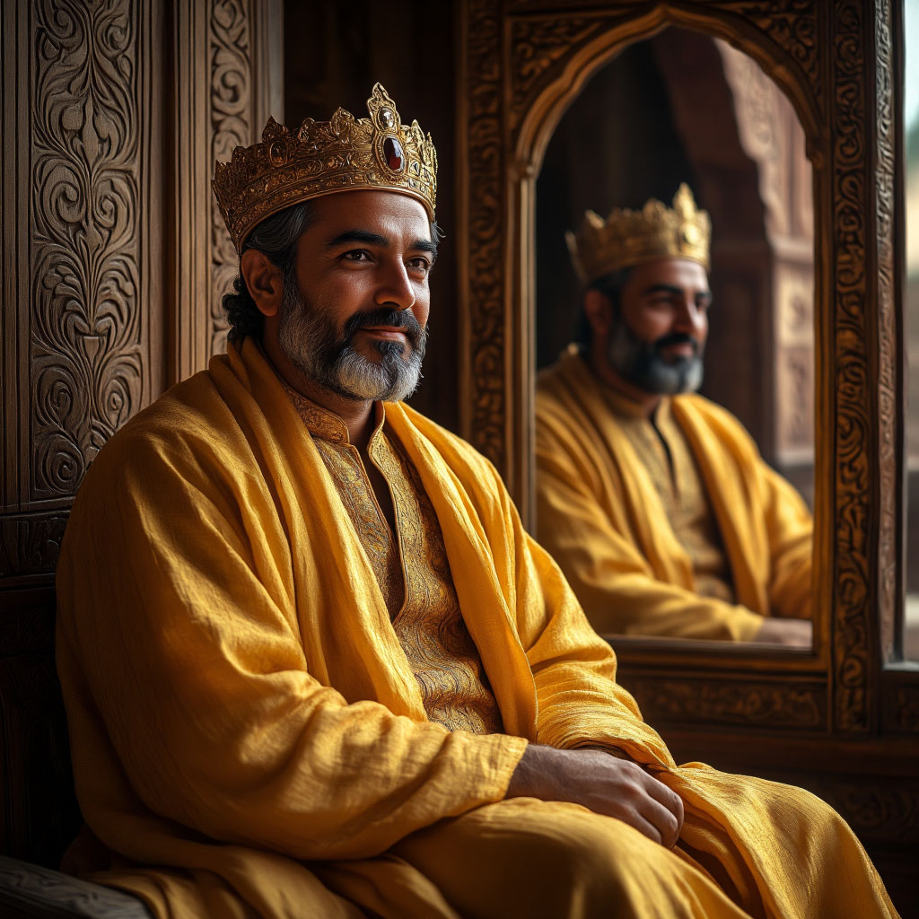 На изображении представлен величественный мужчина в роскошной золотой одежде и короне, сидящий перед зеркалом. Его образ излучает мудрость и уверенность, подчеркивая статус правителя.