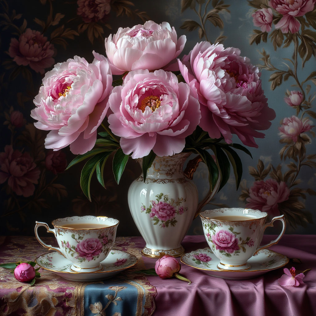 В центре композиции — роскошный букет пионов, наполняющий пространство нежным ароматом. Пышные розовые цветы грациозно расположились в элегантной вазе, их свежесть подчёркивает атмосфера спокойствия и умиротворения. По бокам вазы стоят две винтажные чайные чашки с замысловатым золотым узором, словно приглашающие насладиться моментом. Изысканный фон с утончёнными узорами дополняет атмосферу уюта и элегантности, превращая простую сцену чаепития в произведение искусства.