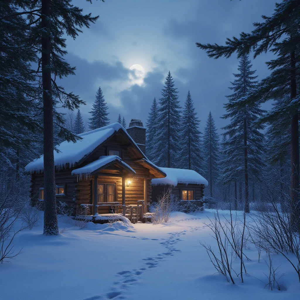 Дорогие друзья! Представьте: домик, который словно спрятался от холода в объятиях леса. Луна светит ярко, а снег искрится, как миллионы маленьких звёзд. Вы — герой этой истории. Что вы чувствуете, стоя у этого домика? Хотите зайти внутрь, где вас ждёт горячий чай и тёплая печь? Придумайте название для этой картины. Например: „Тайна зимнего леса“, „Домик под луной“ или „Снежная сказка“. Расскажите нам о своих мыслях!