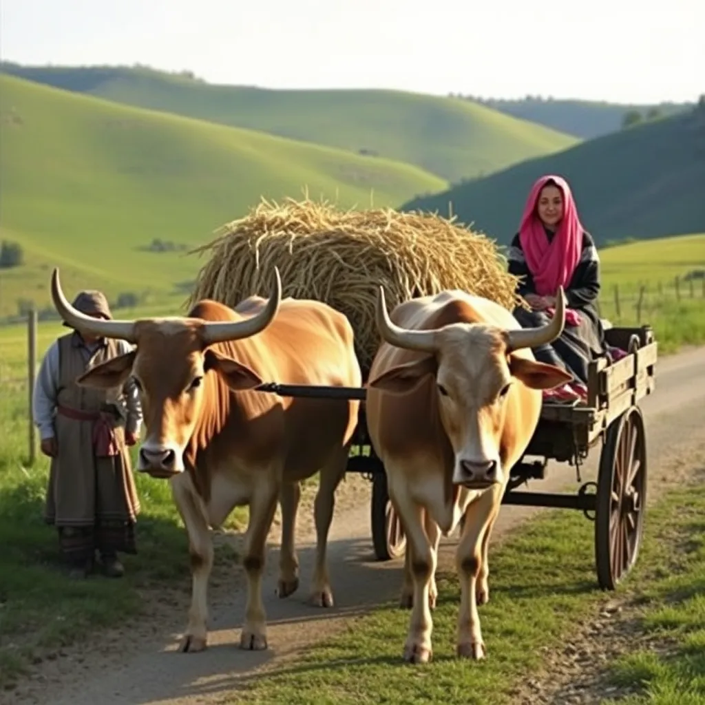 На закате дня по узкой тропинке, окружённой зелёными холмами, двигалась повозка. Её тянули два сильных вола с изогнутыми рогами. На повозке сидела женщина в ярком розовом платке, а рядом шёл мужчина в традиционной одежде. Они везли сено, собранное на полях, чтобы накормить своих животных.
