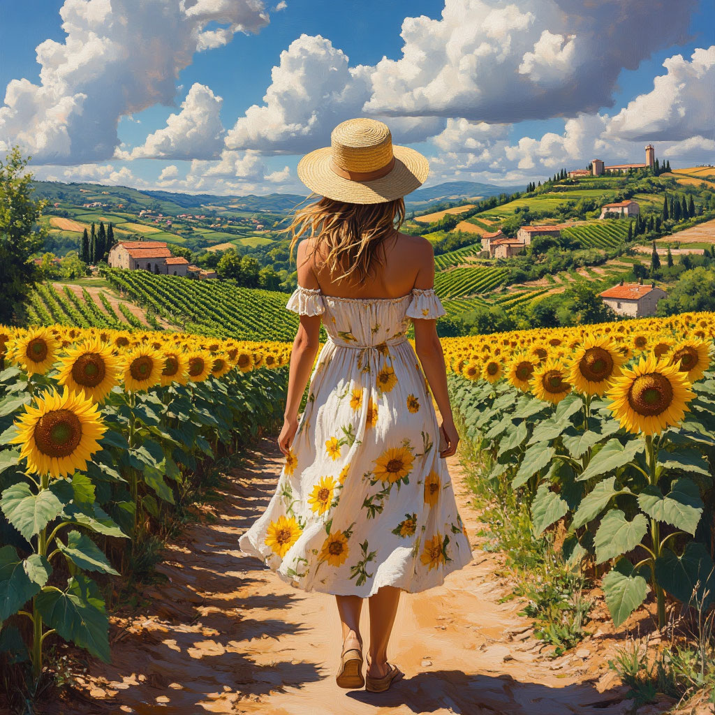 В тот день солнце светило особенно ярко, словно желая подчеркнуть красоту мира вокруг. Лена шла по тропинке, окружённой подсолнухами, которые, казалось, тянулись к ней, приветствуя её своим золотистым сиянием. Её белое платье с подсолнухами на ткани словно сливалось с природой, а соломенная шляпа защищала от палящих лучей.