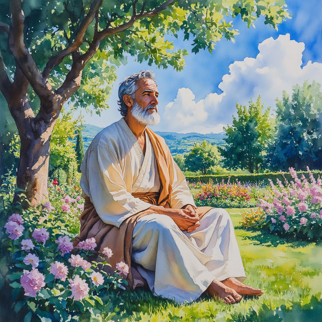 В одном тихом уголке мира, где солнце ласково согревает землю, а цветы шепчутся на ветру, сидел старец. Его седые волосы и борода сияли, как серебро, а взгляд был полон мудрости и спокойствия. Он был хранителем древних знаний, которые передавались из поколения в поколение.