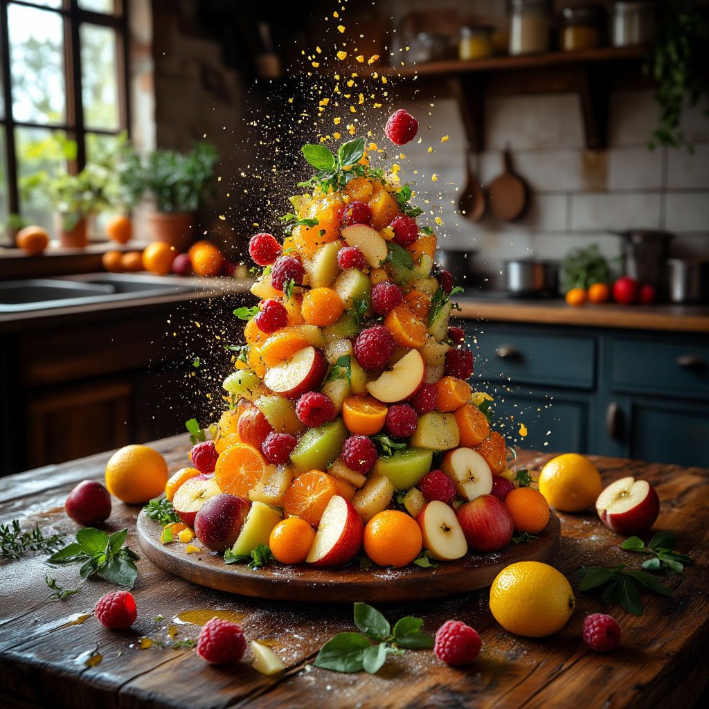 На деревянном столе, словно в сказке, возвышается фруктовая ёлочка. Её основание — сочные яблоки и апельсины, а вершину венчают яркие ягоды малины и черники. Каждый кусочек фруктов, словно капля солнечного света, переливается на свету, создавая ощущение праздника. Вокруг ёлочки рассыпаны свежие листья мяты и капли мёда, добавляя композиции изысканности.