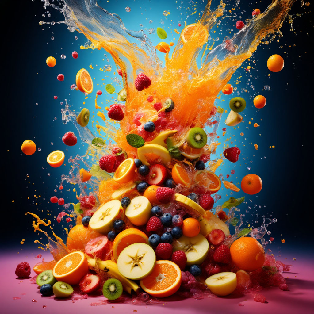 Перед вами яркая и динамичная картина, которая словно оживает на глазах. На ней запечатлен взрыв красок и энергии: сочные фрукты — апельсины, киви, яблоки, малина и черника — разлетаются в разные стороны, окруженные брызгами оранжевого сока. Это изображение напоминает о свежести, радости и жизненной энергии.