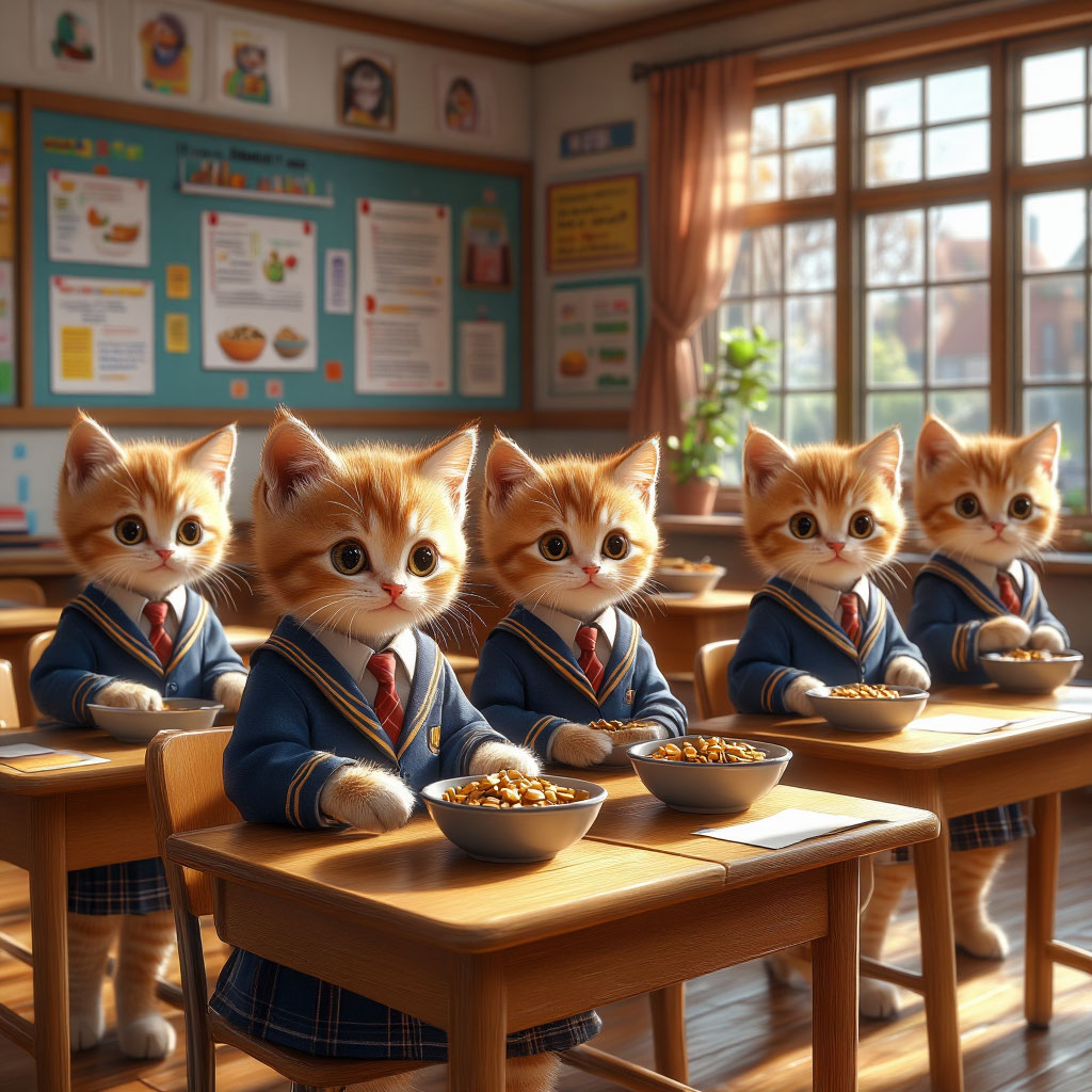 В уютной классной комнате, залитой мягким солнечным светом, собрались маленькие котята в школьной форме. Они сидят за партами, перед ними стоят миски с вкусным кормом. На стенах висят яркие учебные плакаты, а в углу стоит горшок с зелёным растением. Котята выглядят сосредоточенными и готовыми к новым знаниям.