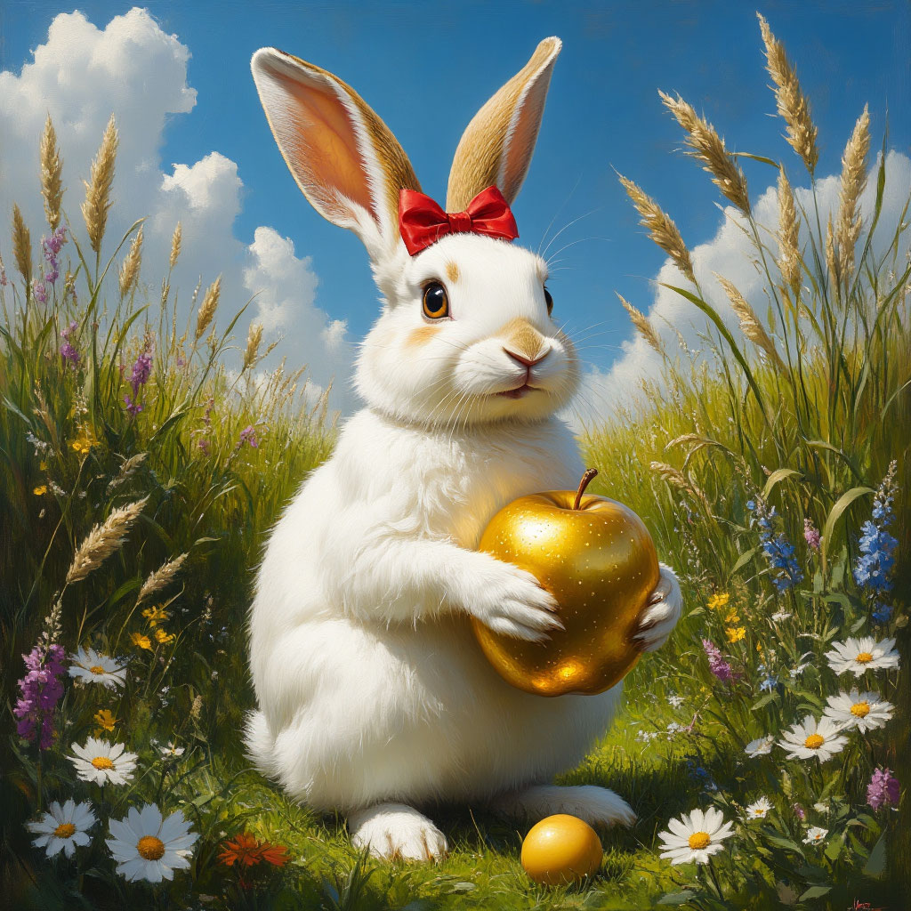 В одном солнечном лугу жил кролик по имени Златик. Его белоснежная шерстка блестела на солнце, а красный бант на ушке делал его самым красивым жителем луга. Но больше всего Златик гордился своим золотым яблоком, которое он нашел однажды в траве.