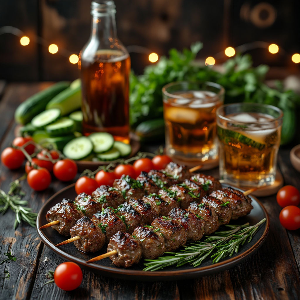 На деревянной тарелке, украшенной веточками розмарина, аппетитно расположились сочные шашлычки из мяса. Их золотистая корочка блестит в свете гирлянд, создавая уютную атмосферу. Рядом — свежие помидоры черри, нарезанные огурцы и ароматная зелень, которые добавляют яркости и свежести.