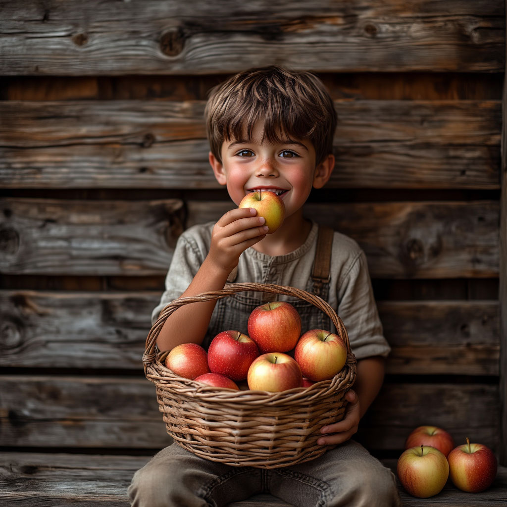 На фоне старой деревянной стены сидел мальчик. Его глаза светились радостью, а улыбка была такой искренней, что казалось, будто он нашёл самое большое сокровище на свете. В руках он держал плетёную корзину, полную ярких яблок, а одно из них уже было у него во рту. Мальчик выглядел довольным и счастливым. Его простая одежда подчёркивала деревенский уют, а яблоки в корзине словно рассказывали историю о тёплом летнем дне.
