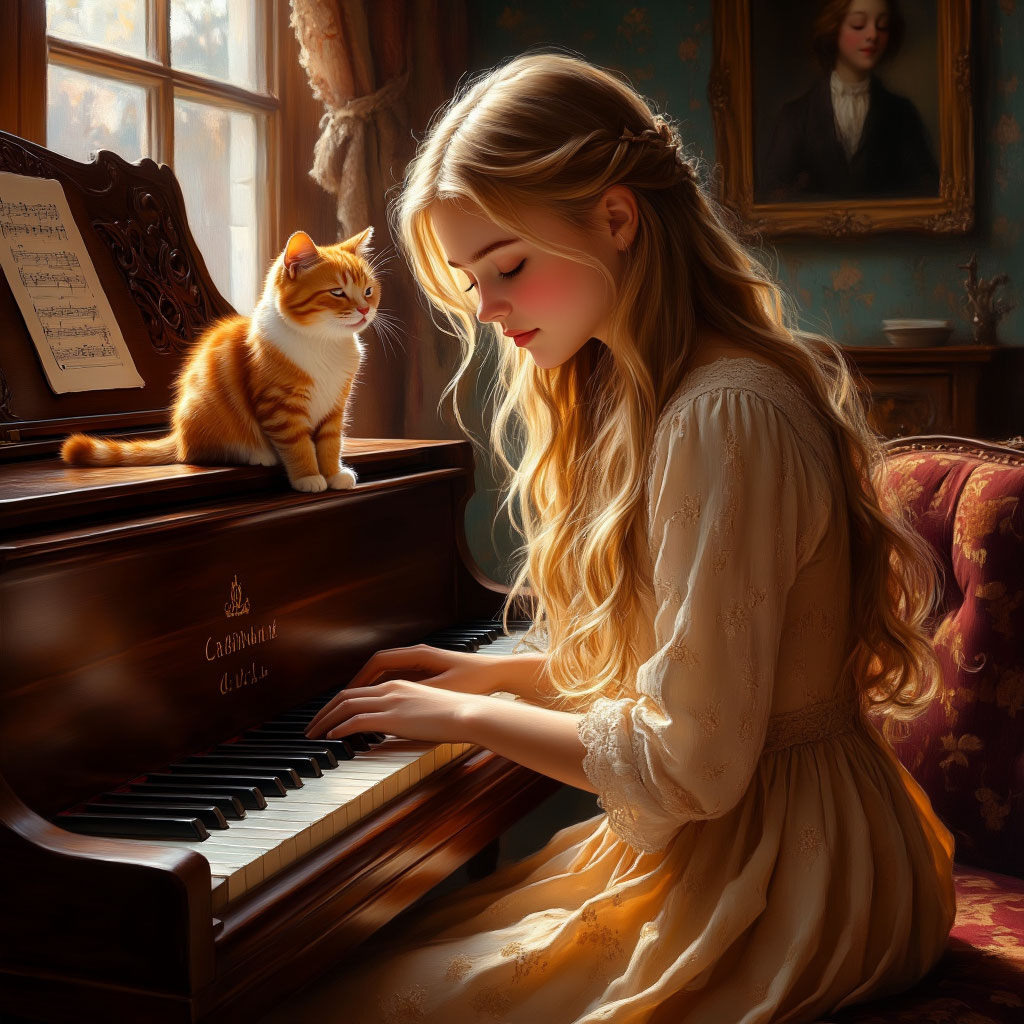 В уютной комнате, наполненной мягким светом, юная девушка с длинными светлыми волосами играет на старинном пианино. Её пальцы легко скользят по клавишам, создавая мелодию, которая словно оживляет пространство. На пианино, словно маленький слушатель, сидит рыжий кот с белыми лапками. Он внимательно смотрит на девушку, будто понимает каждую ноту, которую она играет. Солнечный луч, пробиваясь сквозь окно, мягко ложится на клавиши, добавляя волшебства в эту сцену.