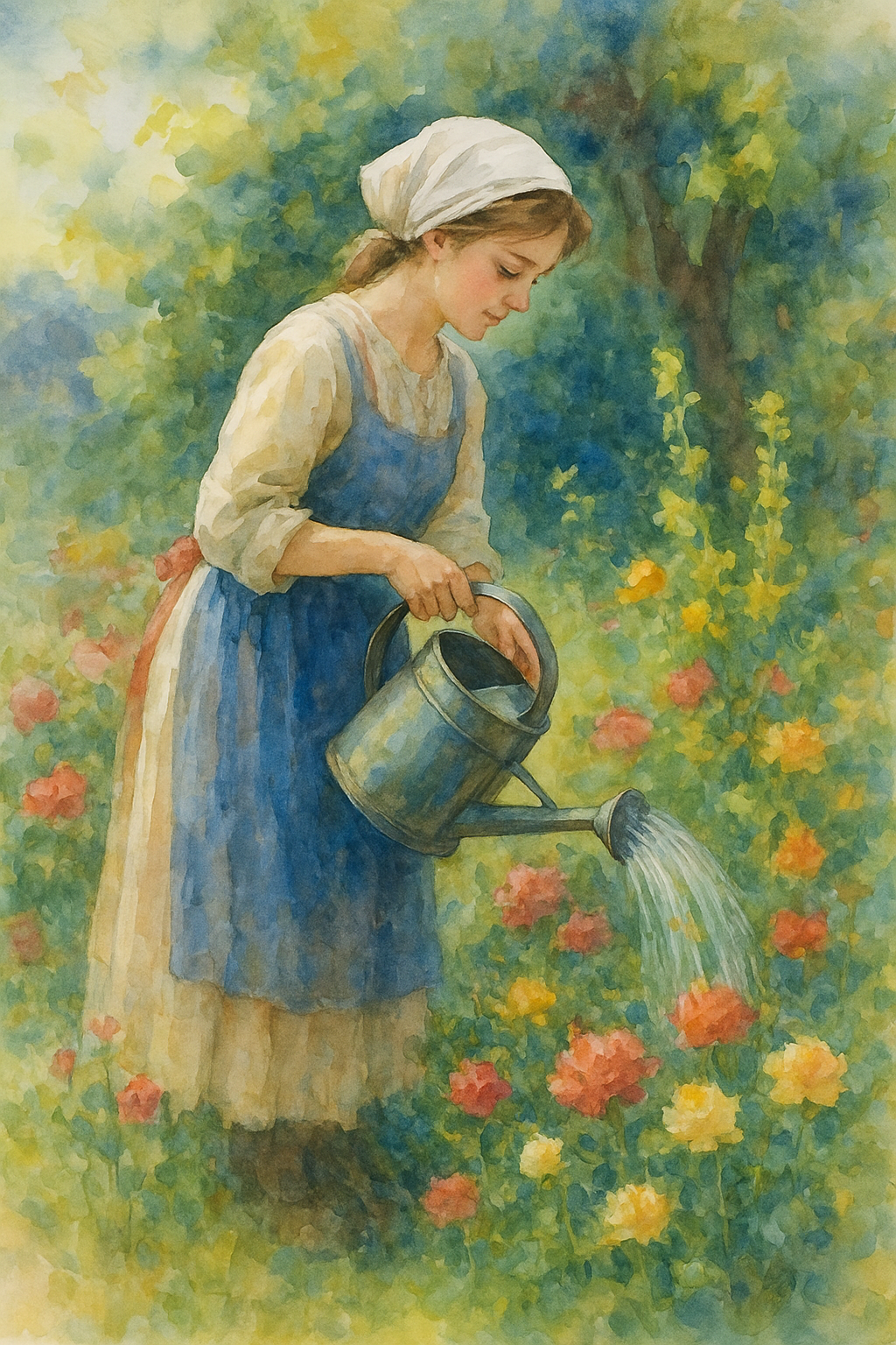 Молодая девушка в деревенской одежде, с белым платком на голове, поливает цветы из металлической лейки в солнечном саду. Вокруг яркие разноцветные цветы — розы, пионы и другие летние растения. Атмосфера тёплого летнего дня. Стиль акварельной живописи, мягкие размытые мазки, светлые пастельные оттенки.