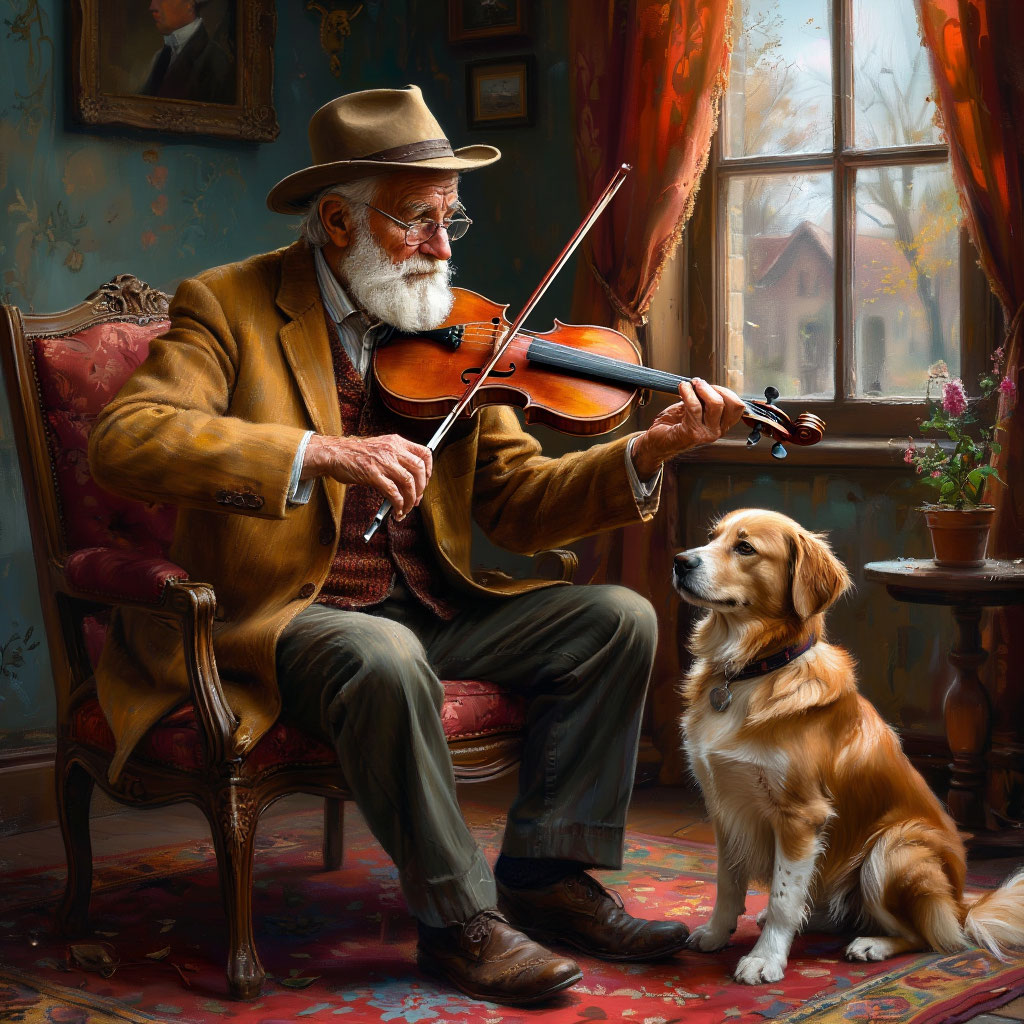 На картине изображён пожилой мужчина в шляпе, сидящий в кресле и играющий на скрипке. Его окружает уютная атмосфера: мягкий свет из окна, старинные шторы и картины на стенах. Рядом с ним сидит золотистый ретривер, внимательно слушающий музыку. Собака выглядит спокойной и преданной, добавляя сцене теплоту и уют.