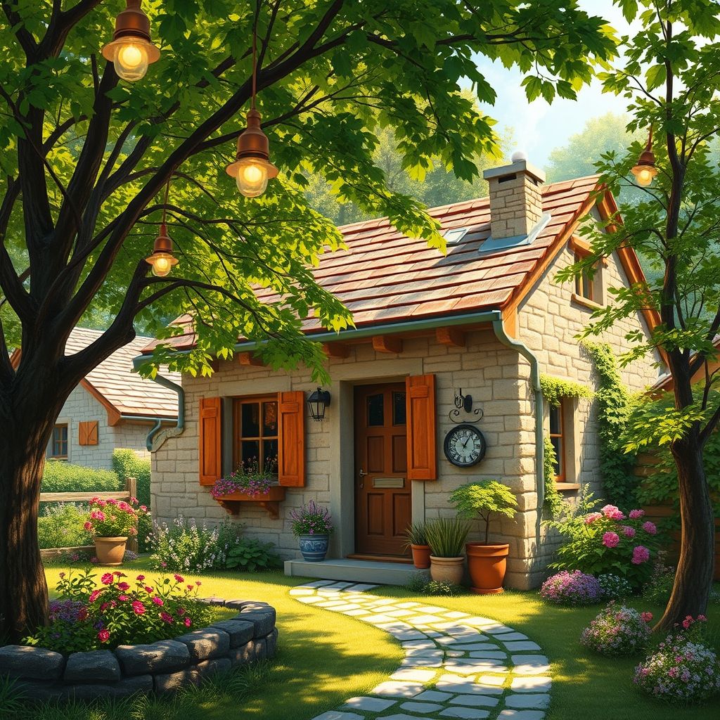 В самом сердце природы, где солнце ласково согревает землю, стоит уютный домик. Его каменные стены хранят тепло летних дней, а деревянная дверь словно приглашает войти и отдохнуть. Вокруг раскинулся сад, полный ярких цветов и зелени, а каменная дорожка, извиваясь, ведет к крыльцу. Вечерние фонари, висящие на деревьях, готовы зажечь мягкий свет, когда солнце скроется за горизонтом. Здесь время словно замирает, позволяя насладиться тишиной и красотой окружающего мира.
