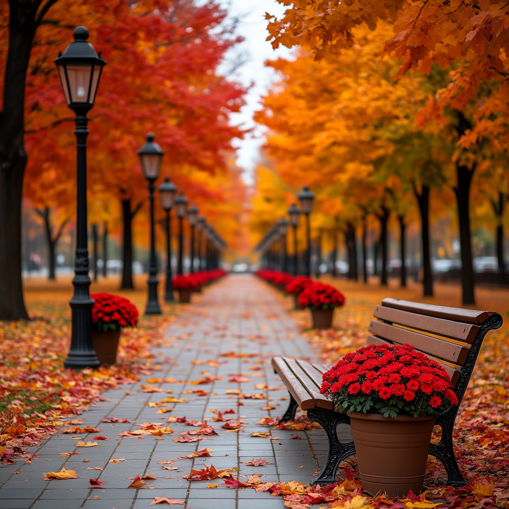 Черные фонарные столбы с классическими стеклянными абажурами стоят вдоль аллеи, добавляя пейзажу нотку элегантности. На переднем плане расположена деревянная скамейка с металлическими элементами, украшенная яркими красными хризантемами в горшках. Она словно приглашает присесть, отдохнуть и насладиться моментом.