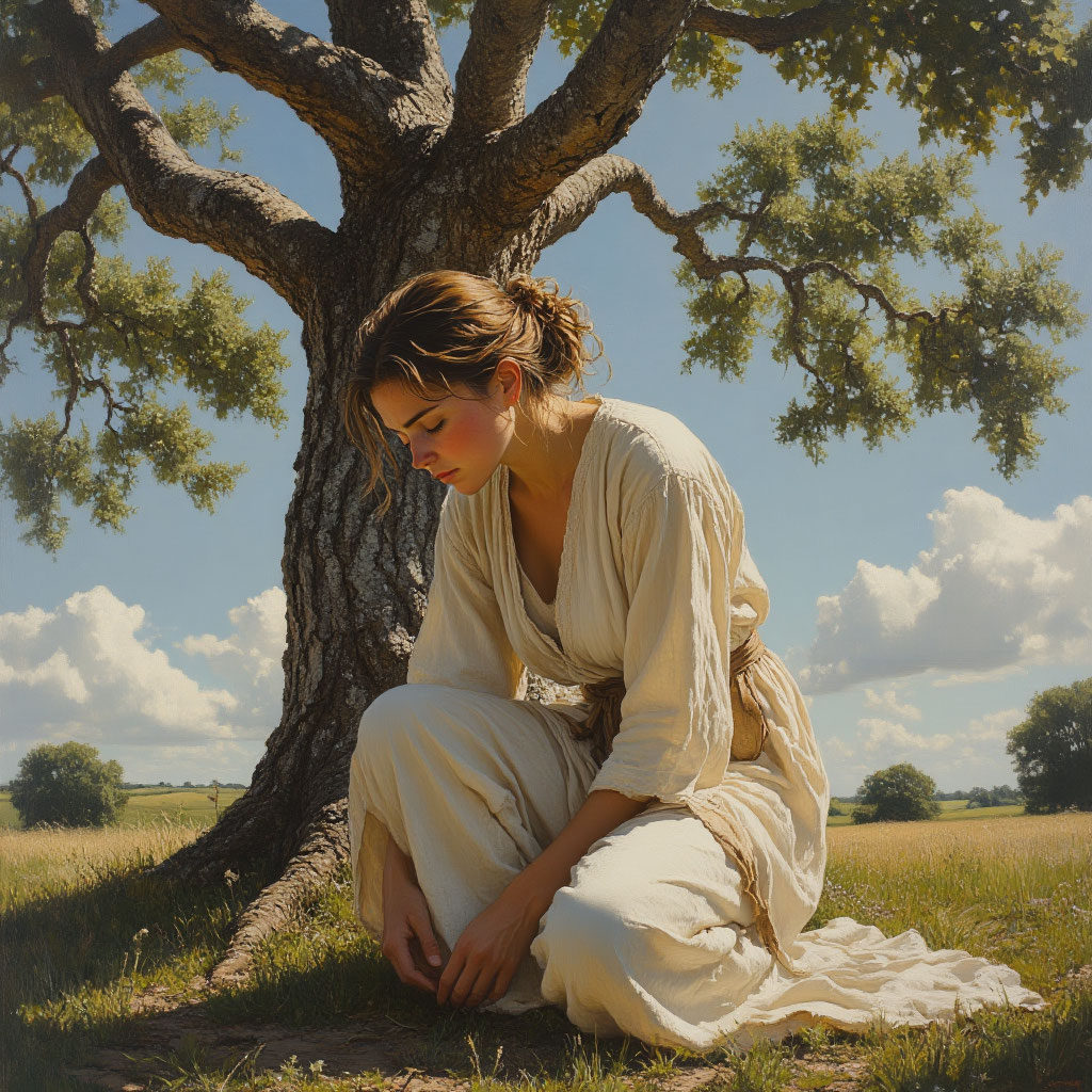 В жаркий летний день девушка присела под старым дубом, чтобы укрыться от палящего солнца. Её взгляд был устремлён вниз, словно она искала ответы на свои мысли в травинках у ног. Ветер ласково играл с её волосами, а вокруг простирались бескрайние поля, наполненные ароматом цветов и шёпотом травы.