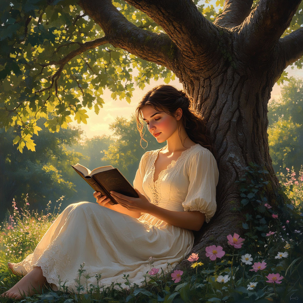 В тихий летний день, когда солнце мягко пробивалось сквозь густую листву, молодая женщина нашла уединение под старым дубом. Её белое платье, словно сотканное из лунного света, мягко струилось по траве, а в руках она держала старинную книгу, страницы которой хранили мудрость веков.