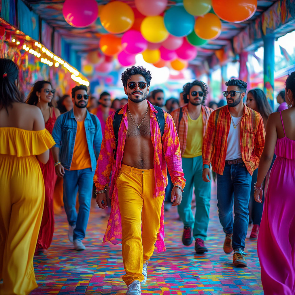 В центре внимания — молодой человек в жёлтых брюках и розовой рубашке с узором. Его уверенная походка и лёгкая улыбка говорят о том, что он наслаждается моментом. Вокруг него — друзья и незнакомцы, каждый из которых добавляет свою нотку в эту симфонию красок.