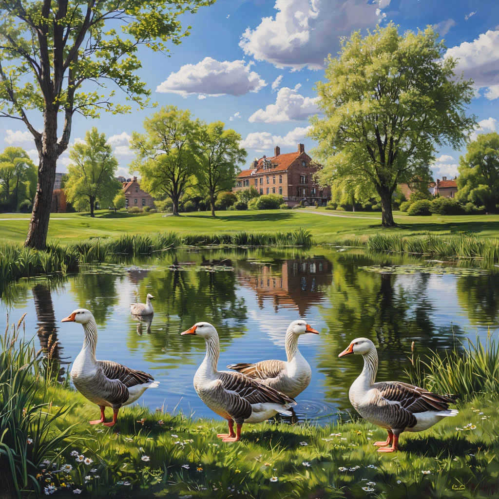 На краю деревни, где зелёные луга встречаются с гладью пруда, царит особая тишина. Здесь, среди высоких деревьев и отражения старинного особняка в воде, гуляют гуси. Они неспешно бредят по траве, наслаждаясь теплом летнего дня.