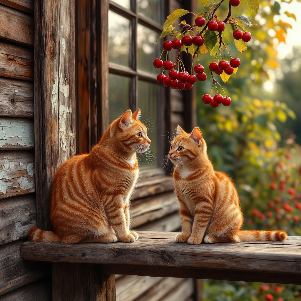 На деревянной скамье у старого деревенского дома сидели два рыжих кота. Они смотрели друг на друга, словно вели безмолвный разговор. Ветка вишни с яркими красными ягодами нависала над ними, словно приглашая к угощению.