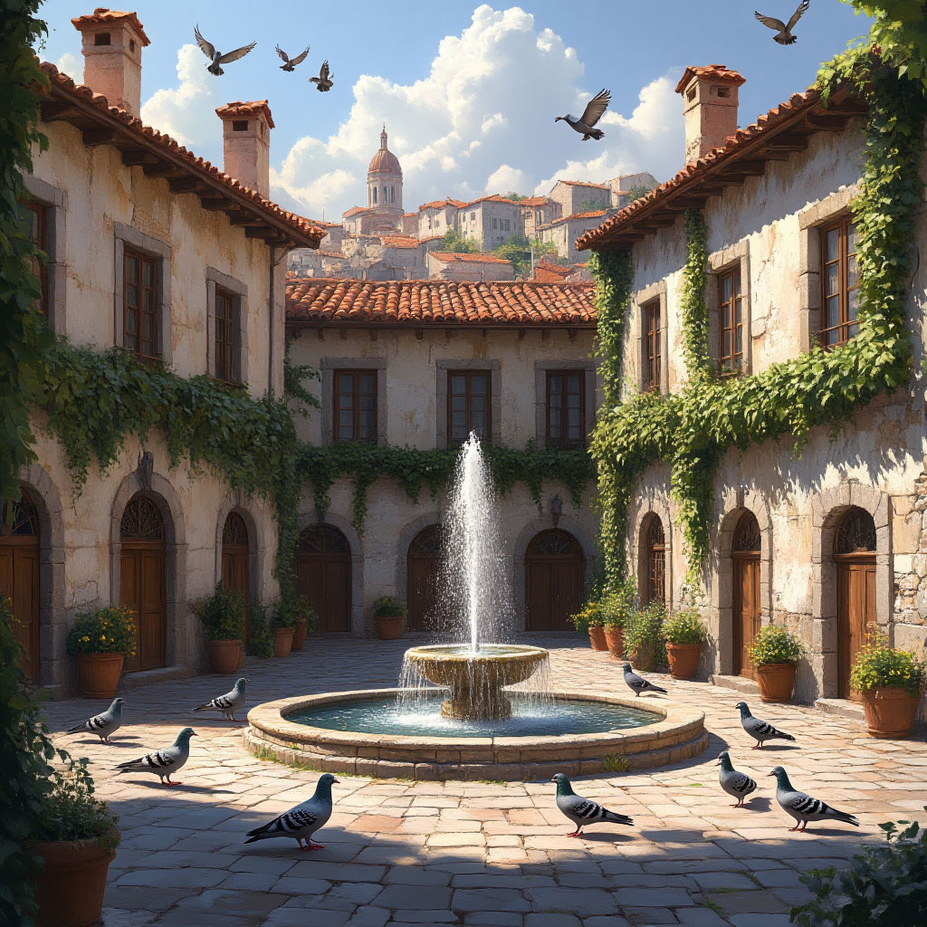 Перед вами чарующее изображение старинного города, где каждый камень хранит свою историю. Ветхие дома, увитые плющом, создают неповторимую атмосферу уюта и спокойствия. Фонтан на площади и голуби на брусчатке добавляют картине живости и тепла.