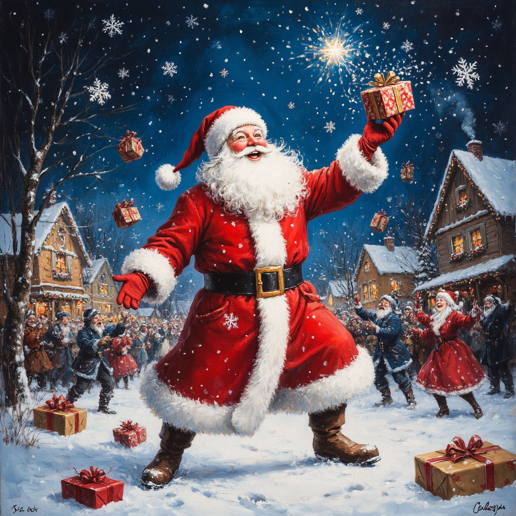 В морозный зимний день, когда снег кружится в воздухе, словно танцуя, на заснеженной площади разворачивается настоящее чудо. В центре внимания — Дед Мороз в ярком красном кафтане с белоснежной опушкой. Его лицо озаряет широкая улыбка, а в руке он держит подарок, который вот-вот вручит кому-то из собравшихся. Дед Мороз словно приглашает всех присоединиться к весёлому танцу, раскинув руки в приветственном жесте.