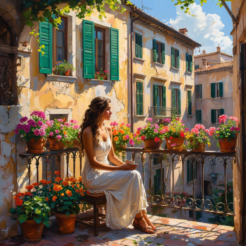 На балконе старинного итальянского дворика, где солнце ласково согревает каменные стены, сидела молодая женщина. Её белое платье мягко струилось, словно отражение света на воде. В руках она держала чашку с ароматным кофе, а взгляд её был устремлён вдаль, туда, где небо встречалось с крышами домов.