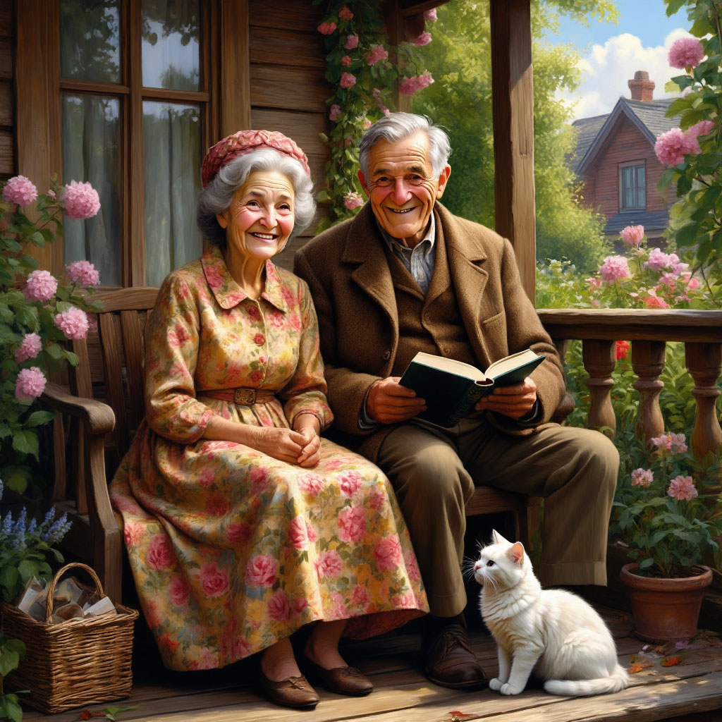 На уютной деревянной веранде, окружённой цветущими кустами роз, сидят пожилая пара и их белый кот. Бабушка в ярком платье с цветочным узором и красной шляпке улыбается, глядя на своего мужа. Дедушка, одетый в тёплый коричневый пиджак, читает книгу, а кот, сидя у его ног, внимательно смотрит на него.