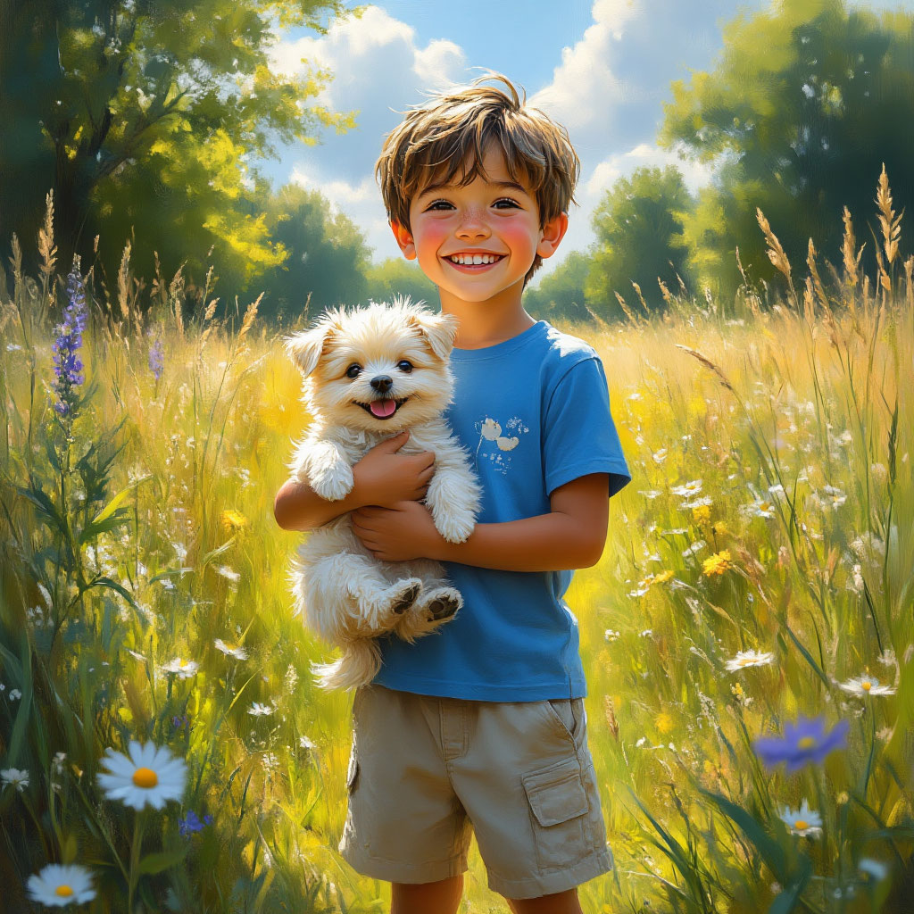 Маленький мальчик по имени Миша гулял по цветущему лугу, держа на руках своего пушистого друга — щенка по кличке Снежок. Они наслаждались теплым летним днем, слушали пение птиц и играли среди высоких трав. Миша чувствовал, что в такие моменты жизнь наполняется радостью и счастьем.