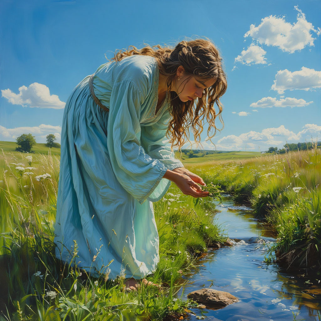 В солнечный летний день девушка в голубом платье склонилась над ручьём. Её длинные волосы развевались на ветру, а взгляд был устремлён на воду, словно она искала в ней ответы. Ручей тихо журчал, отражая облака и зелень вокруг. Девушка держала в руках травинку, будто это был ключ к чему-то важному.