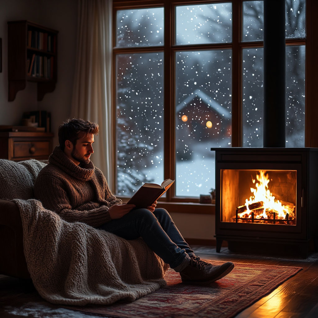 В уютной комнате, где мягкий свет камина танцует на деревянных полах, царит атмосфера покоя и уюта. За окном кружатся снежинки, укрывая мир белым покрывалом, а внутри дома тепло и тихо. Молодой человек, укутанный в мягкий плед, сидит в кресле, погруженный в чтение книги. Его лицо освещено мягким светом, который отражается от страниц, создавая ощущение, что он находится в своем собственном мире.