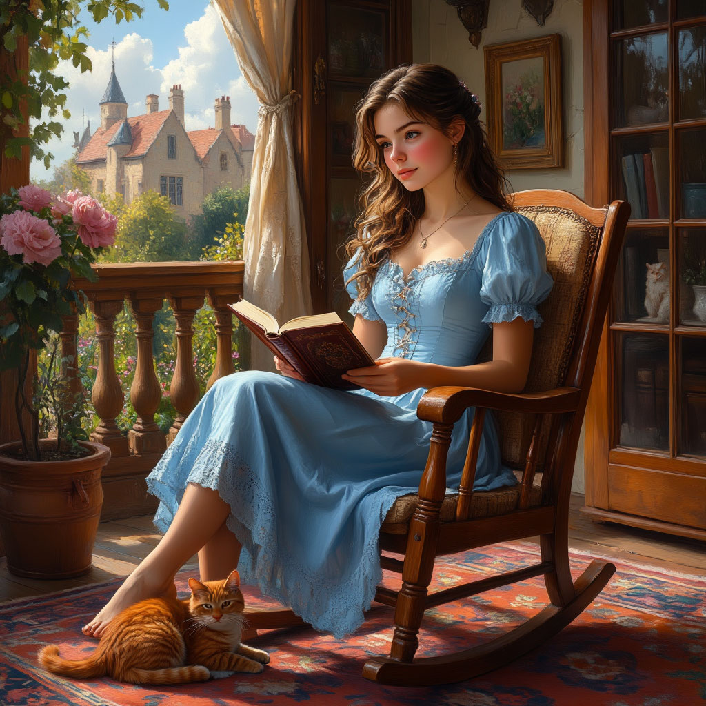 На террасе старинного дома, окружённого цветущими розами, сидит молодая девушка в голубом платье. Её взгляд устремлён в книгу, которую она держит в руках. Рядом с ней уютно устроился рыжий кот, наслаждаясь теплом солнечных лучей. Лёгкий ветерок играет с занавесками, а за окном виднеется величественный замок, утопающий в зелени.