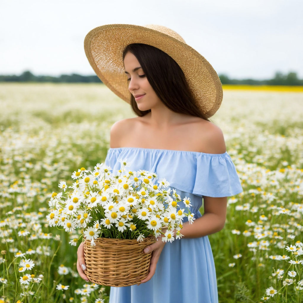 На фотографии изображена девушка в голубом платье с открытыми плечами, стоящая в бескрайнем поле ромашек. На голове у нее соломенная шляпа с широкими полями, которая защищает от солнца. В руках она держит плетеную корзину, наполненную свежими ромашками. Ее взгляд направлен вниз, а на лице отражается спокойствие и умиротворение. Фон — яркое летнее поле, которое простирается до самого горизонта, создавая ощущение свободы и гармонии с природой.