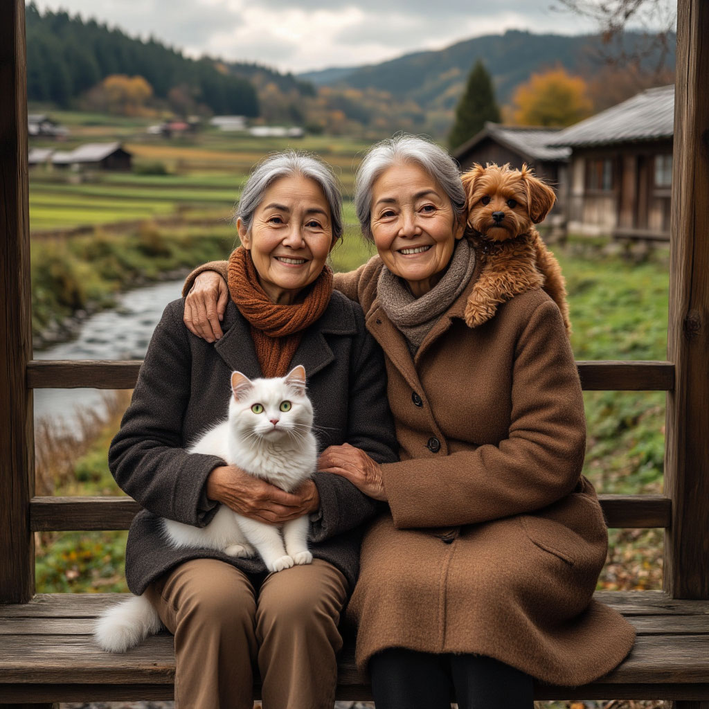 На деревянной веранде сидят две пожилые женщины, наслаждаясь осенним днём. Одна из них держит на руках белоснежного кота, а другая обнимает маленького рыжего щенка. Их лица светятся добротой и радостью, создавая атмосферу уюта и тепла. На заднем плане виднеется живописный пейзаж с рекой, зелёными полями и домами, окружёнными деревьями.