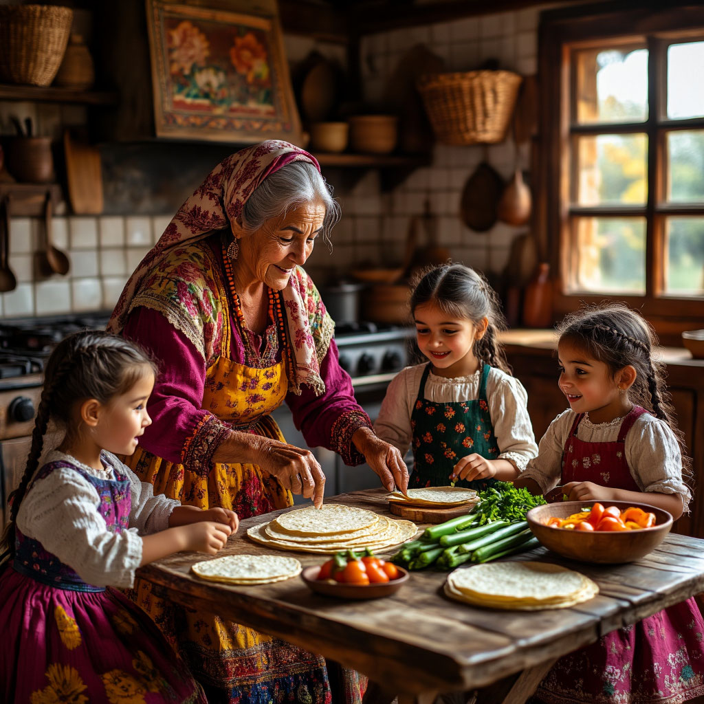 В уютной деревенской кухне, где солнечные лучи мягко ложились на деревянный стол, бабушка рассказывала девочкам секреты приготовления гёзлеме. Её руки ловко заворачивали тонкие лепёшки, а дети с интересом наблюдали, как из простых ингредиентов рождается что-то волшебное.