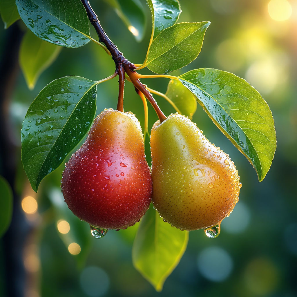 Раннее утро. Легкий туман окутывает сад, словно мягкое одеяло. На ветке груши, словно два драгоценных камня, висят плоды. Один — насыщенного красного цвета, другой — золотисто-желтый, оба покрыты каплями росы, которые переливаются на солнце, как бриллианты.