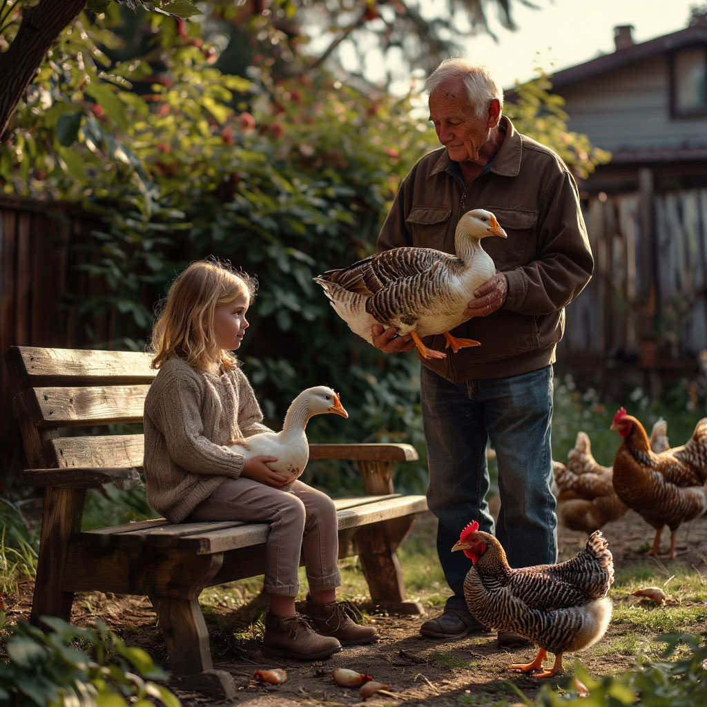 На краю деревни, в уютном дворе, где солнце мягко ложится на траву, дедушка и внучка проводят время с гусями. Внучка, сидя на деревянной скамейке, держит на руках белого гуся, который доверчиво уткнулся клювом в её ладонь. Дедушка, стоя рядом, держит крупного серого гуся, который, кажется, внимательно слушает их разговор.
