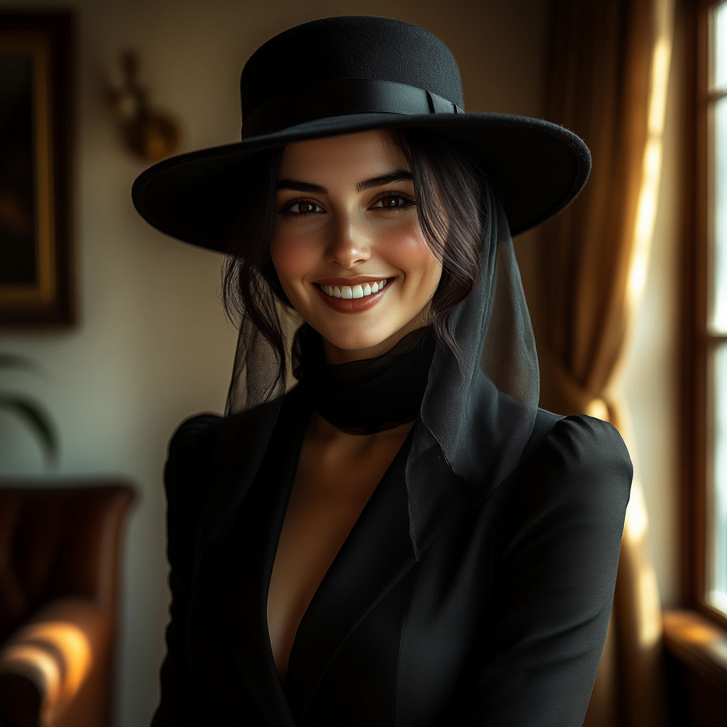 Перед вами загадочный портрет незнакомки, чья улыбка таит в себе множество тайн. Полутёмный фон и вуаль создают особую атмосферу таинственности, а лёгкая улыбка добавляет образу очарования и притягательности. Этот портрет словно приглашает нас заглянуть за завесу тайны.