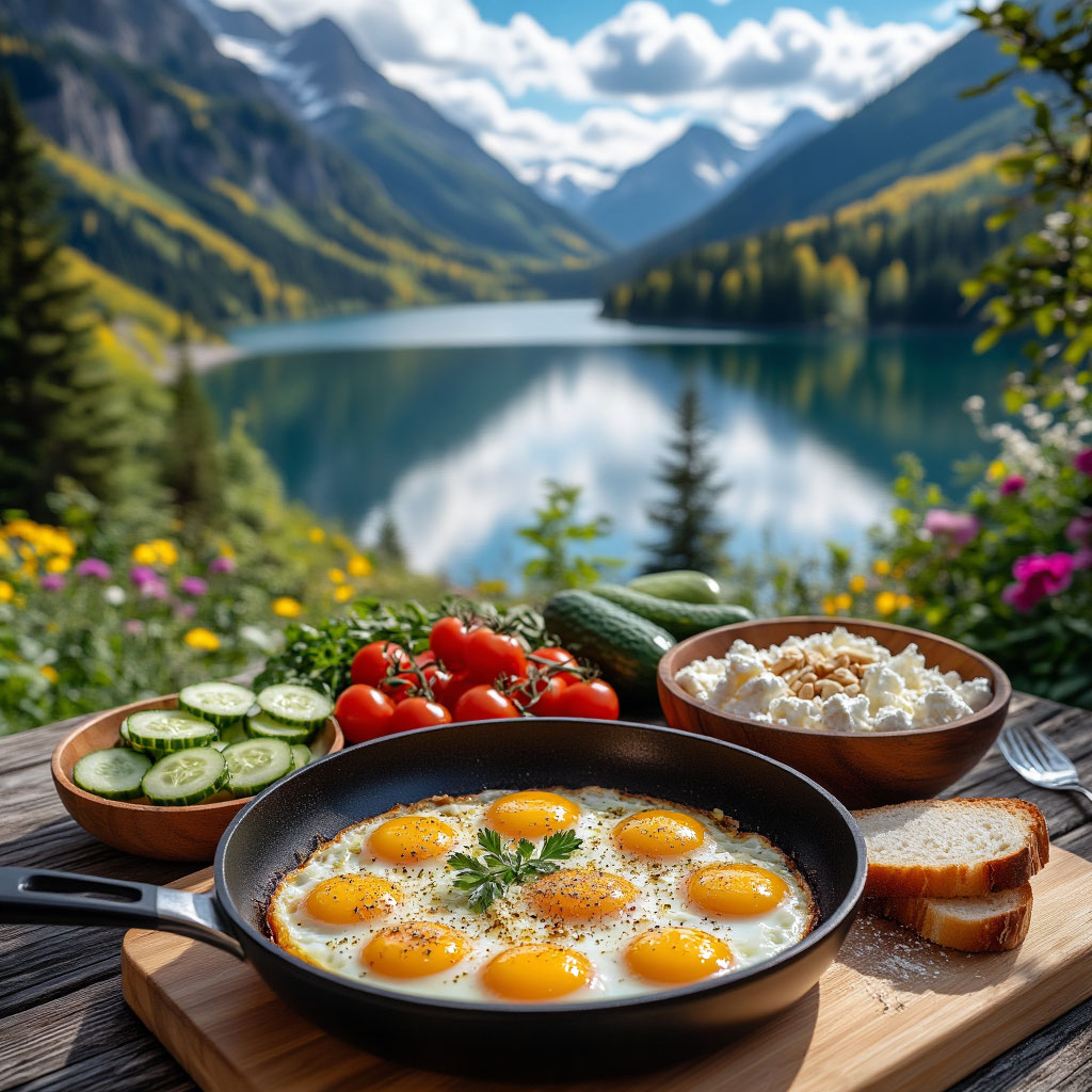На деревянном столе, стоящем прямо у воды, красуется аппетитный завтрак. В центре внимания — румяная яичница из нескольких яиц, украшенная веточкой свежей зелени. Рядом — миска с нежным творогом, посыпанным золотистыми орехами, и тарелка с яркими помидорами черри и хрустящими огурцами. Ломтики свежего хлеба завершают эту гастрономическую картину.