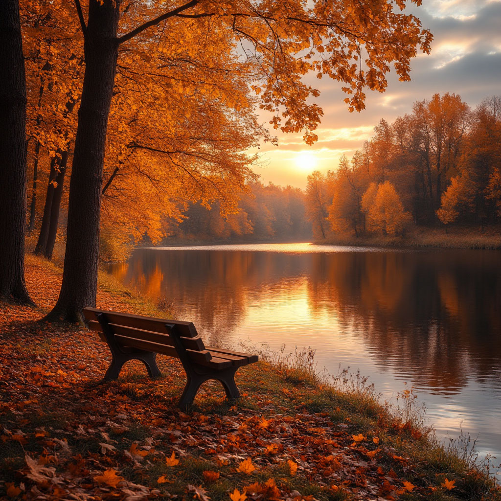 В этом осеннем пейзаже царит умиротворение. Деревянная скамейка, стоящая на берегу реки, словно приглашает присесть и насладиться моментом. Золотистые листья деревьев, отражаясь в спокойной воде, создают ощущение гармонии. Солнце, медленно скрывающееся за горизонтом, окрашивает небо в теплые оттенки, добавляя картине мягкости и уюта.