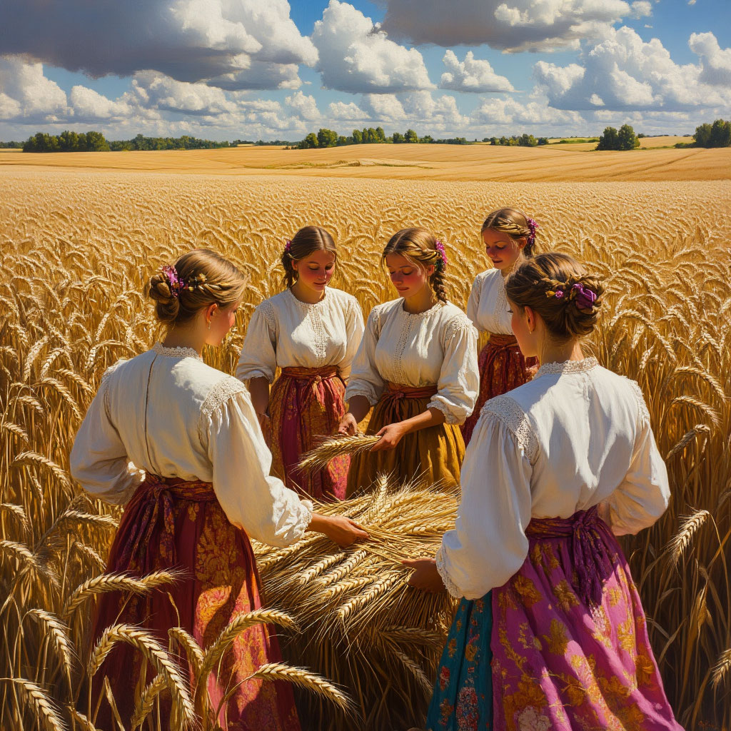В одном из живописных уголков России, где пшеничные поля простираются до самого горизонта, девушки собрались в центре поля. Их наряды, украшенные яркими цветами, словно отражали красоту природы вокруг. Они работали вместе, связывая снопы пшеницы, и их смех разносился по полю, наполняя воздух радостью.