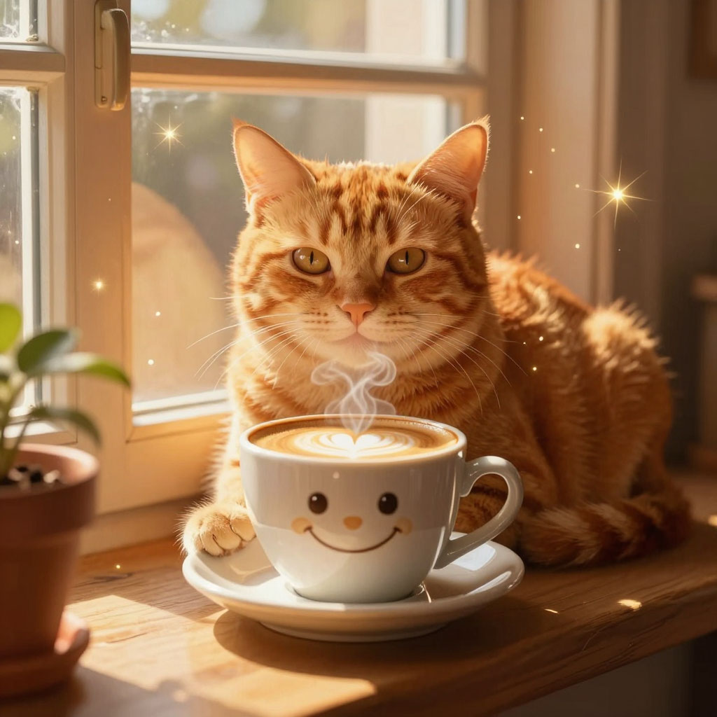 Каждое утро рыжий Марс ждал, когда на подоконник заглянет первое солнце. Но настоящая магия начиналась, когда хозяйка ставила рядом свою любимую чашку. Марс верил, что пар над кофе — это маленькие добрые духи, которые приносят в дом удачу. Он зажмуривался, прижимал лапку к теплой керамике и начинал тихонько мурчать, «подзаряжая» напиток счастьем на весь день.